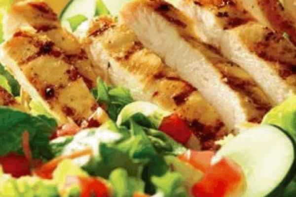 A classic house salad featuring crisp lettuce, greens, tomatoes, bell pepper, cheese, chicken and avocado.