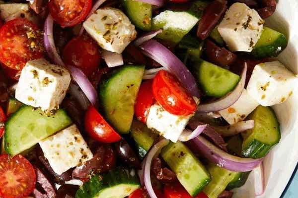 Feta cheese, stuffed grape leaves, tomatoes, red onions, and olives in a bed of greens.